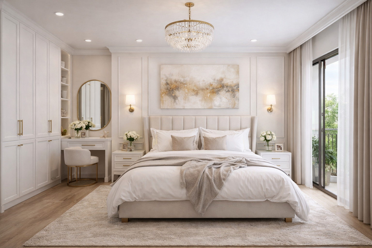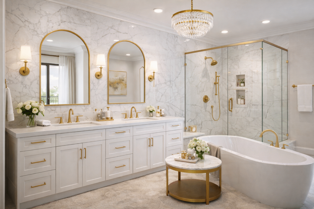 Start with soft whites like ivory or cream to keep spaces airy and calm. Avoid harsh tones and let natural light enhance the beauty of the interiors. Use gold accents sparingly in lighting, mirrors, wall mouldings, and hardware to add subtle sophistication.
