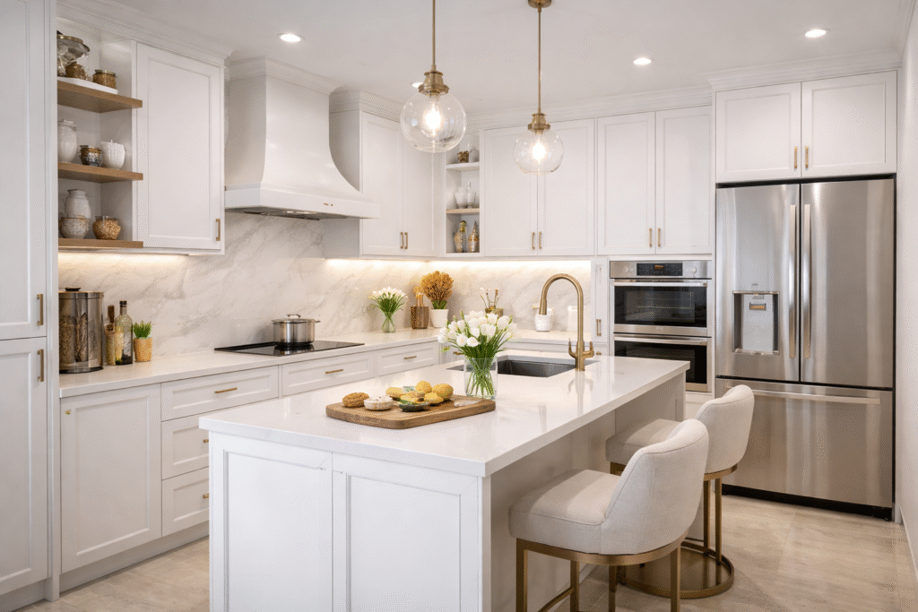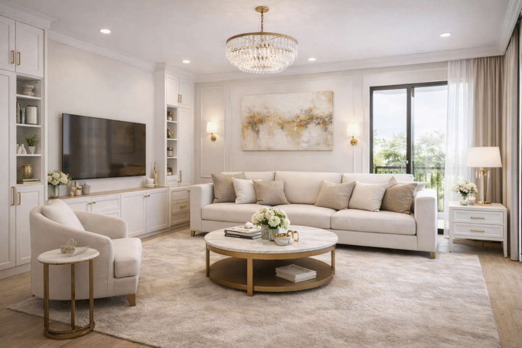 French interior design is all about timeless elegance and quiet luxury. A white and gold colour theme creates homes that feel bright, refined, and welcoming—never overdone.